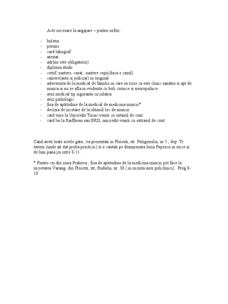 Ma angajez sa respect prevederile contractului individual de munca, sarcinile din fisa postului si programul de lucru stabilit. Fisa de verificare a actelor necesare pentru inscriere la concursul de angajare. Copie de pe actul de identitate (buletin sau carte de identitate) al persoanei care solicită angajarea; La încheierea contractului individual de muncă. Incadrare in grupul de handicap.