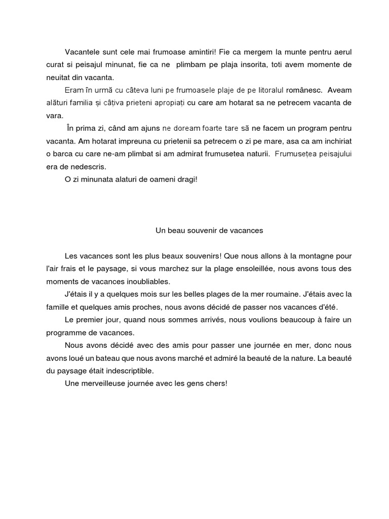Una dintre ele este tot despre vacanța de vară. Compunere in limba franceza despre vacanta. Muntii erau atat de inalti de parca varfurile lor strapungea cerul senin. Şi pentru că se apropie, să o întâmpinăm cu zâmbetul pe buze, poftă de distracţie şi câteva glume. Vreau o descriere despre cel mai bun prieten in franceza.