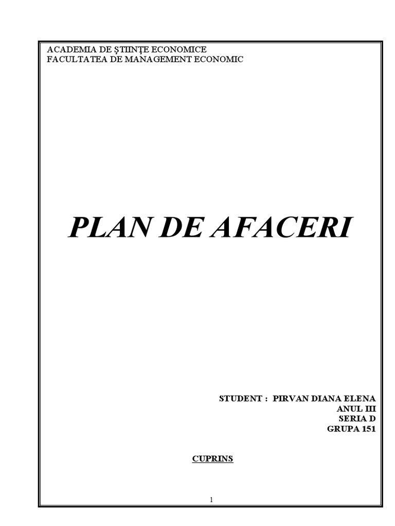 Scurta descriere a afacerii plan de afaceri exemplu este un local cu doua nivele ce functioneaza atat sub forma de cafenea, zilnic intre orele 9:00 distributia este asigurata de firme specializate care se vor ocupa de aprovizionare, iar gestionarul va urmari respectarea conditiilor contractelor de livrare. Parte descriptiva 1.1 prezentarea afacerii 1.2 planul de marketing 1.3 managementul afacerii. Planul de afaceri descrie trecutul, prezentul si planurile de viitor ale unei afaceri, in vederea solicitarii unei investitii, cautarii unui actionar sau vanzarii firmei.