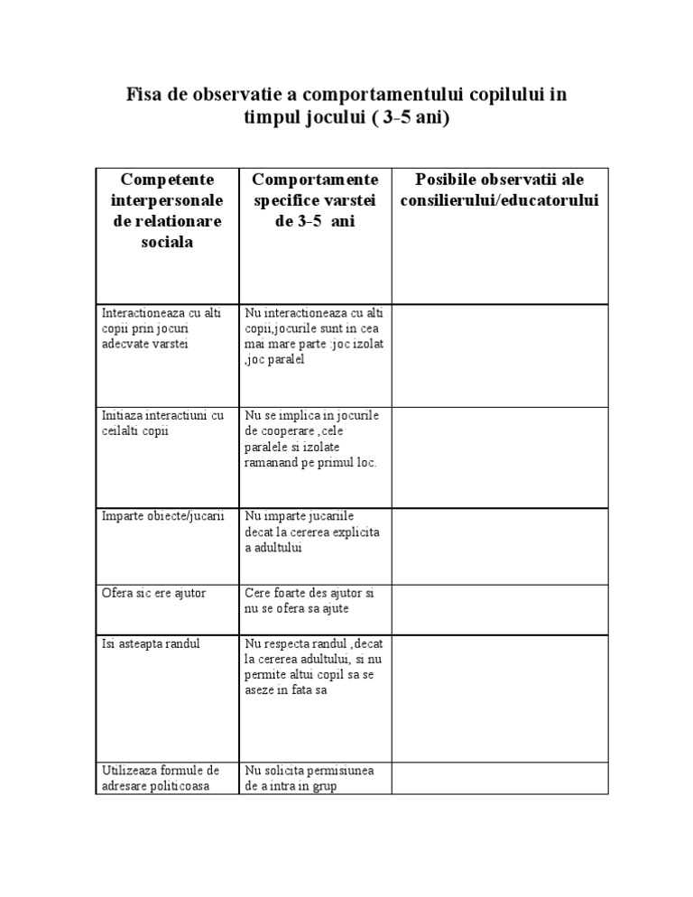 Fisa De Observare A Comportamentului Prescolarului Completata