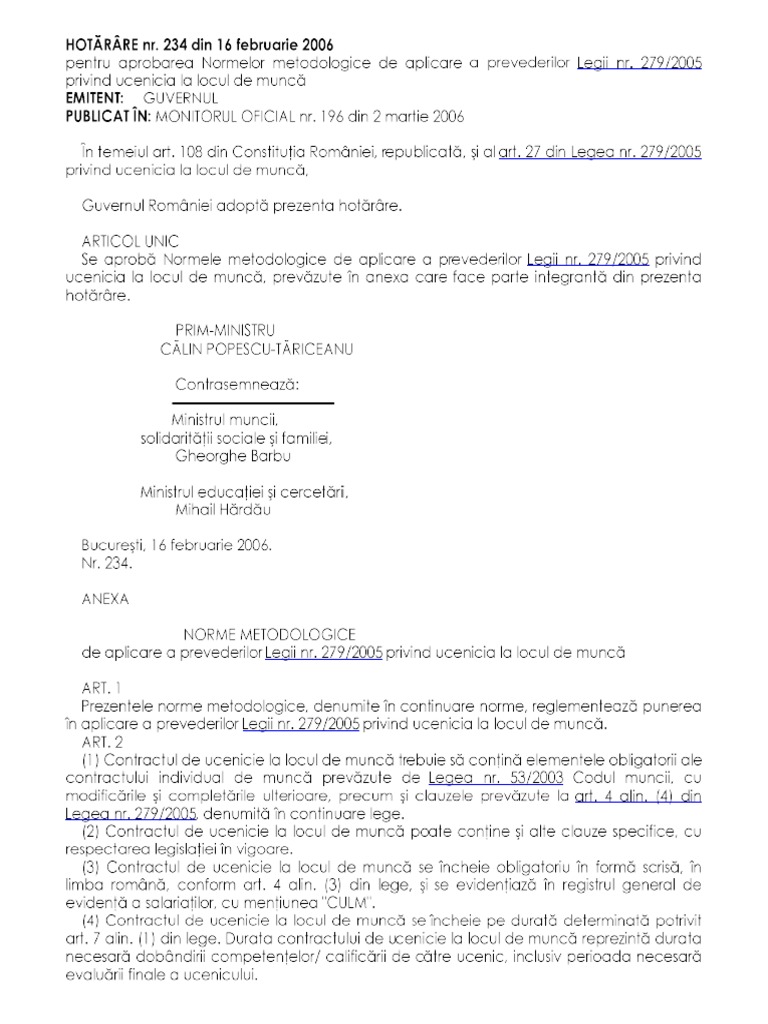 Potrivit actului normativ, cheltuielile pentru formarea profesională a salariaţilor care au statut de ucenic se deduc, după caz. Lista locurilor de muncă vacante, disponibile în moldova și peste hotare. A fost aprobata hotararea pentru modificarea si completarea normelor metodologice de aplicare a prevederilor legii nr.279/2005, privind ucenicia la locul de munca, aprobate prin hotararea guvernului nr 234/2006.