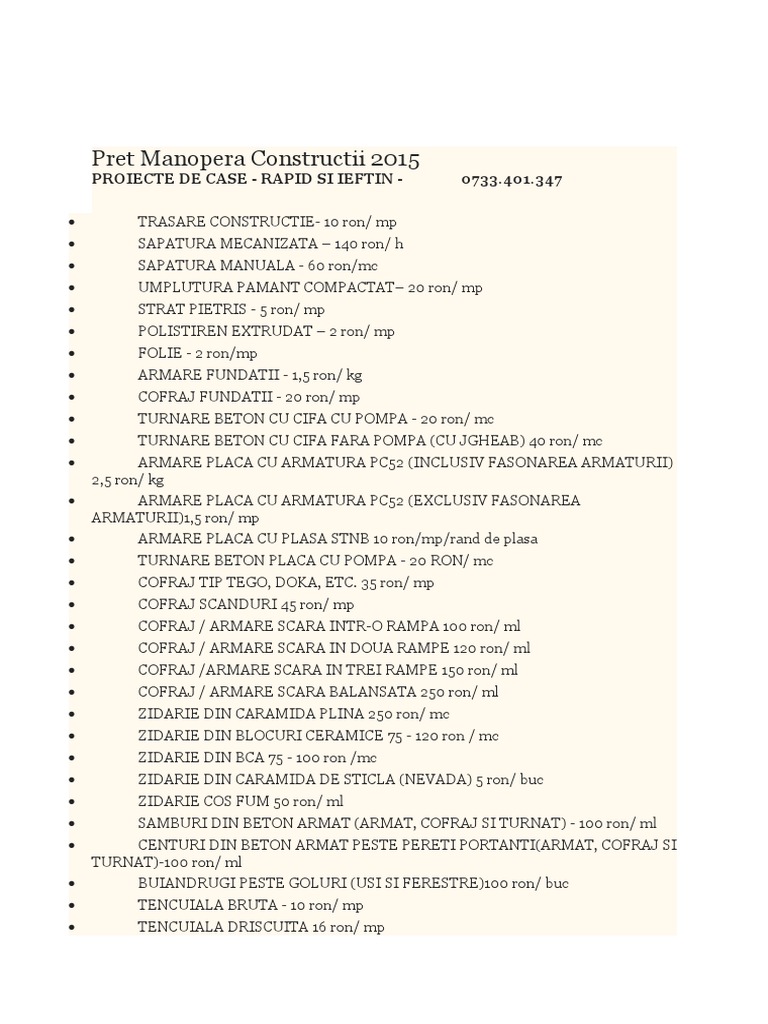 Preturi Manopera Constructii 2018 Cluj
